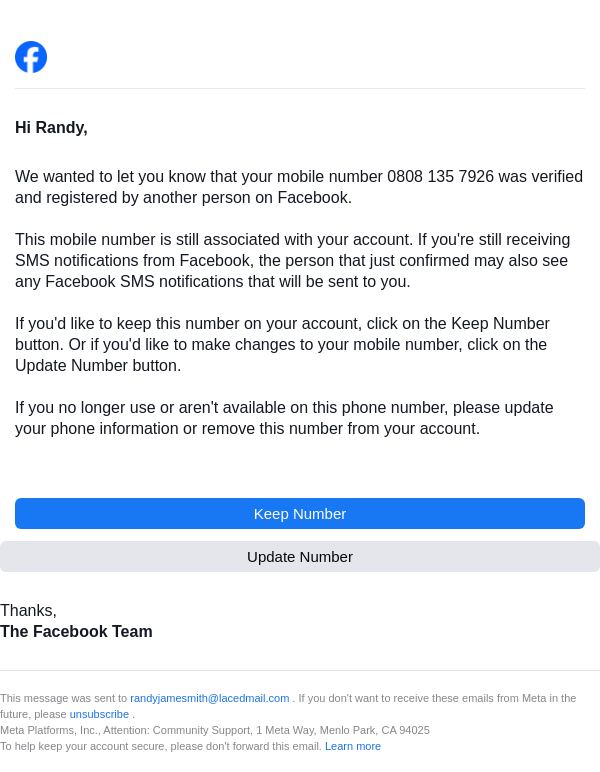 To: randyjamesmith@lacedmail.com From: security@facebookmail.com Received: 2026-01-20 15:56:22.995459