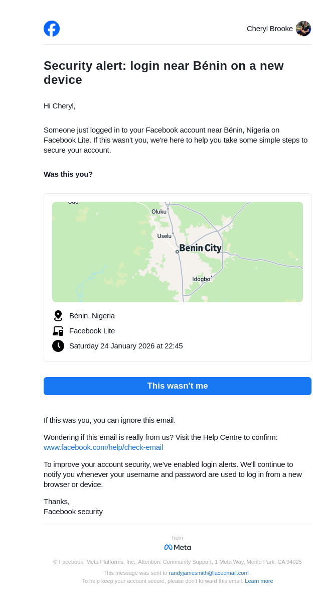 To: randyjamesmith@lacedmail.com From: security@facebookmail.com Received: 2026-01-24 22:46:07.616552