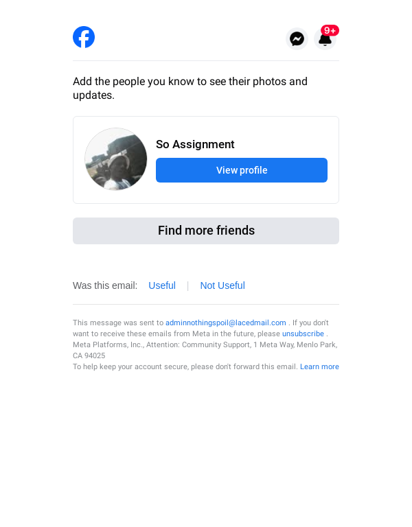 To: adminnothingspoil@lacedmail.com From: friendsuggestion@facebookmail.com Received: 2026-01-25 12:22:23.165570