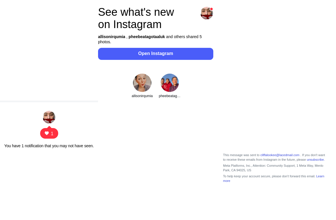 To: cliffalookee@lacedmail.com From: posts-recap@mail.instagram.com Received: 2026-02-06 05:49:20.067011