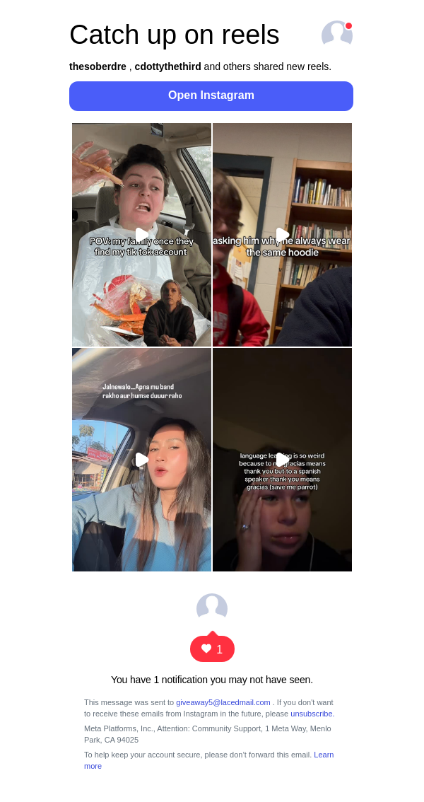 To: giveaway5@lacedmail.com From: posts-recap@mail.instagram.com Received: 2026-02-09 14:58:18.929148