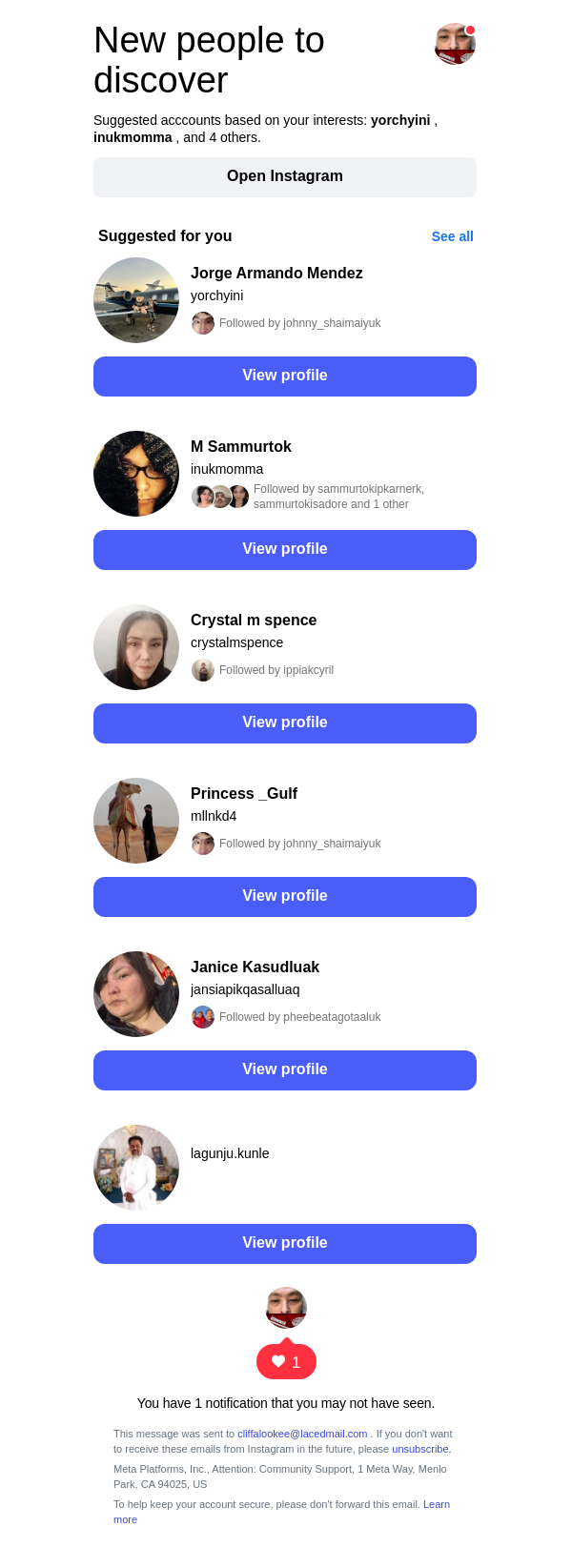 To: cliffalookee@lacedmail.com From: follow-suggestions@mail.instagram.com Received: 2026-02-10 17:09:37.476081