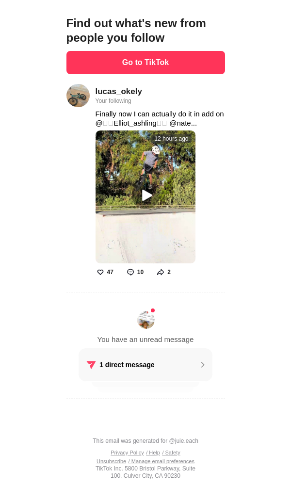 To: jullieleach242@lacedmail.com From: notification@service.tiktok.com Received: 2026-02-16 23:12:46.630430