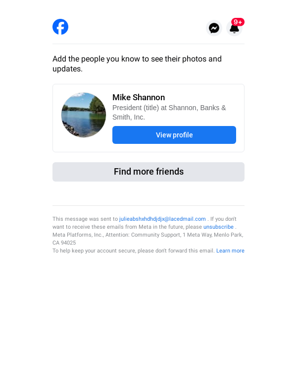 To: julieabshxhdhdjdjx@lacedmail.com From: friendsuggestion@facebookmail.com Received: 2026-02-21 20:19:34.385860