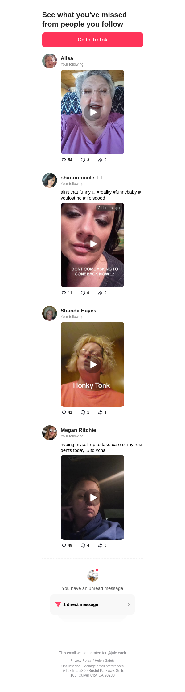 To: jullieleach242@lacedmail.com From: notification@service.tiktok.com Received: 2026-02-22 00:21:44.061650
