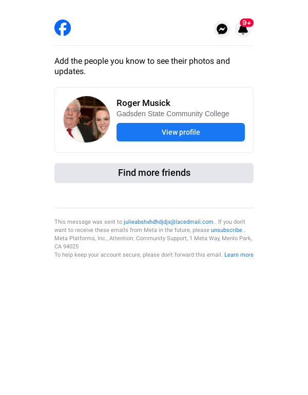 To: julieabshxhdhdjdjx@lacedmail.com From: friendsuggestion@facebookmail.com Received: 2026-02-22 19:11:08.515607