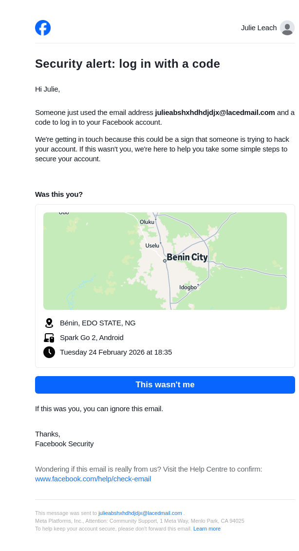 To: julieabshxhdhdjdjx@lacedmail.com From: security@facebookmail.com Received: 2026-02-24 18:35:08.289219