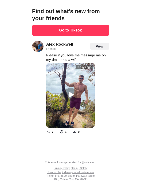To: jullieleach242@lacedmail.com From: notification@service.tiktok.com Received: 2026-02-25 20:26:43.505994