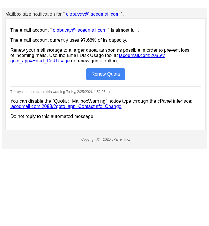 lacedmail.com WARNING: The email account "olobuyay@lacedmail.com" is almost full.