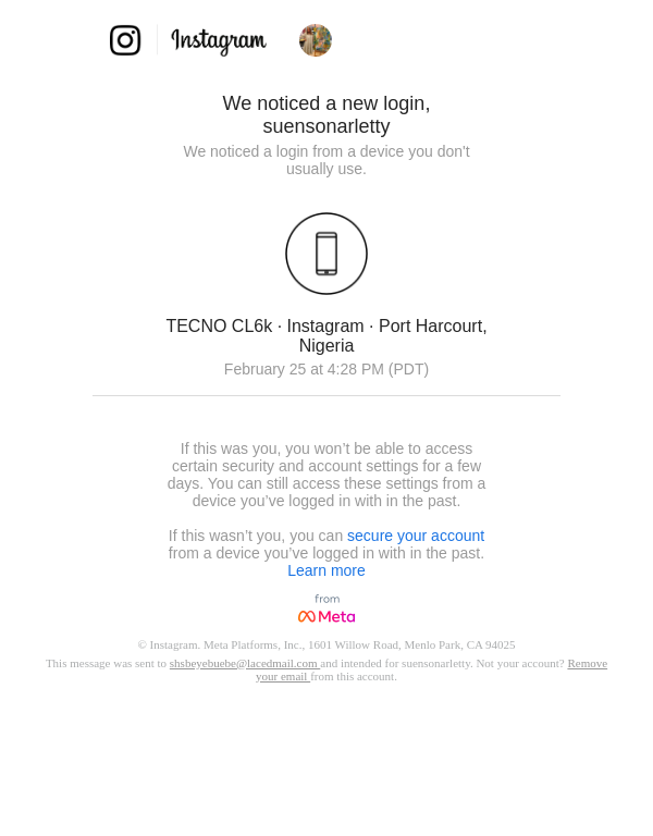 To: shsbeyebuebe@lacedmail.com From: security@mail.instagram.com Received: 2026-02-26 00:28:36.519613