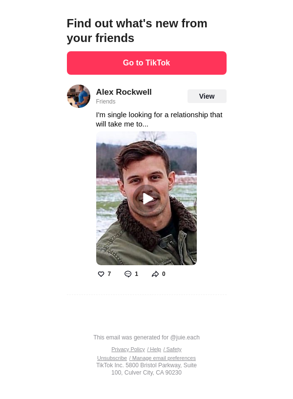 To: jullieleach242@lacedmail.com From: notification@service.tiktok.com Received: 2026-02-26 16:16:55.788219