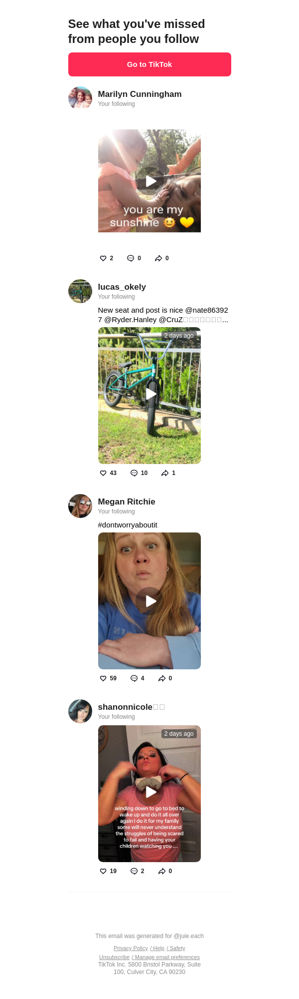To: jullieleach242@lacedmail.com From: notification@service.tiktok.com Received: 2026-02-28 16:56:20.874713