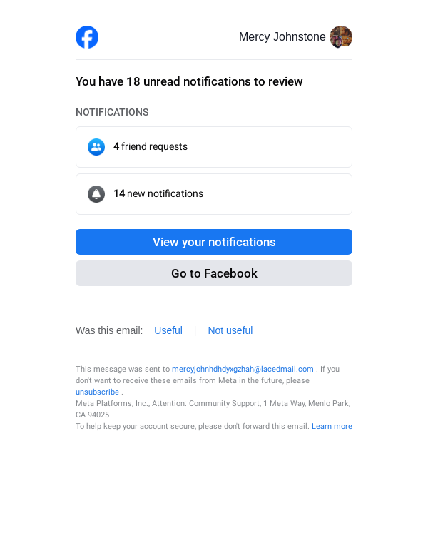 To: mercyjohnhdhdyxgzhah@lacedmail.com From: reminders@facebookmail.com Received: 2026-03-02 12:16:10.825196