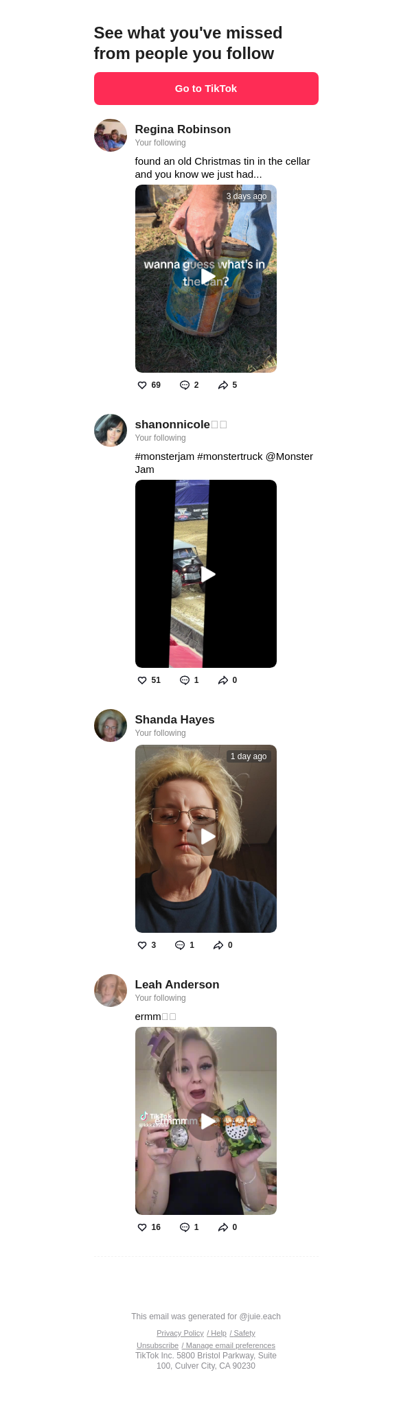 To: jullieleach242@lacedmail.com From: notification@service.tiktok.com Received: 2026-03-03 16:14:52.831566