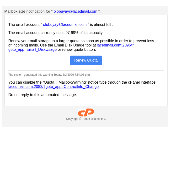lacedmail.com WARNING: The email account "olobuyay@lacedmail.com" is almost full.