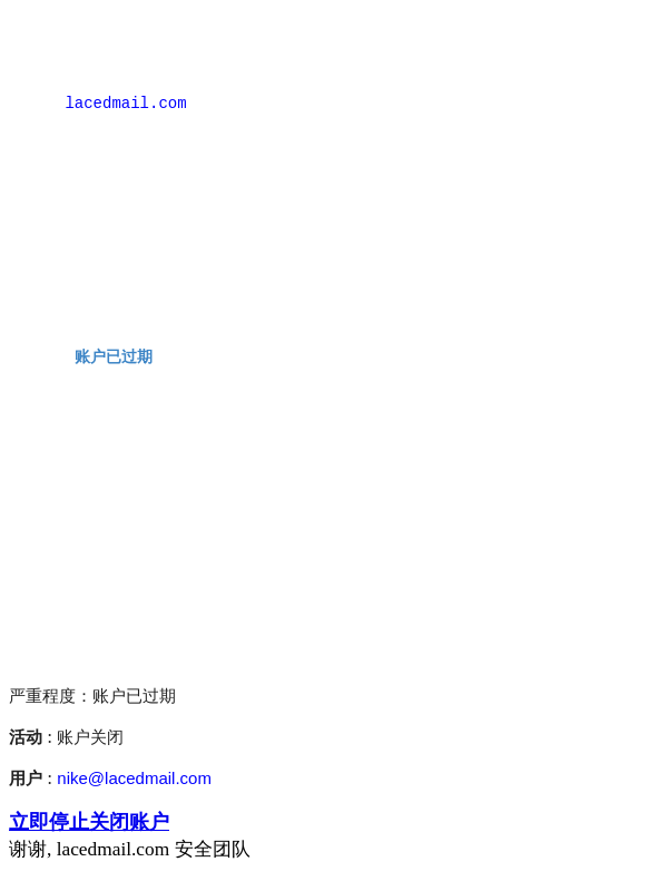 [nike@lacedmail.com]: 您的账户已过期,请立即采取行动,否则您的账户将被删除。