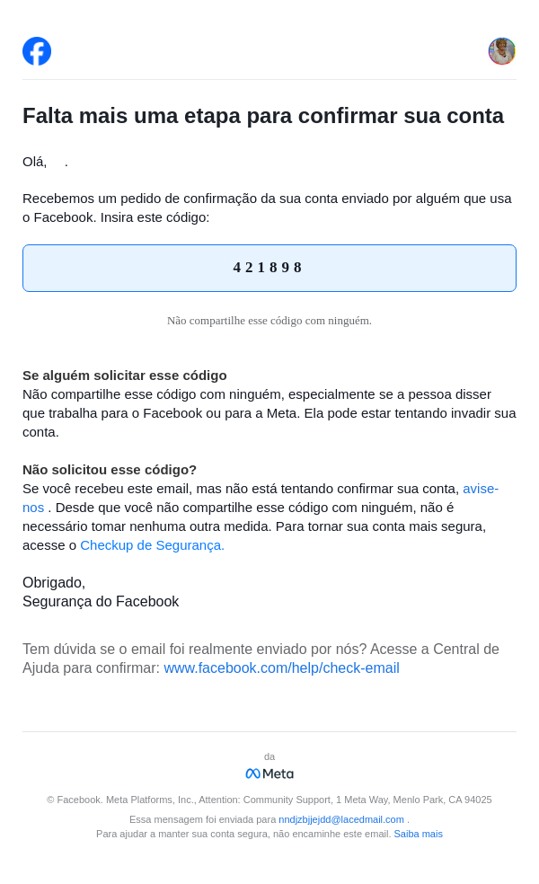 Seu código do Facebook é 421898