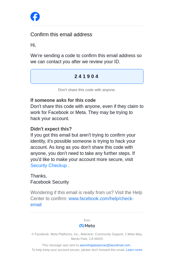 To: aaronhsjjejeparnas@lacedmail.com From: security@facebookmail.com Received: 2026-03-18 14:42:31.329121