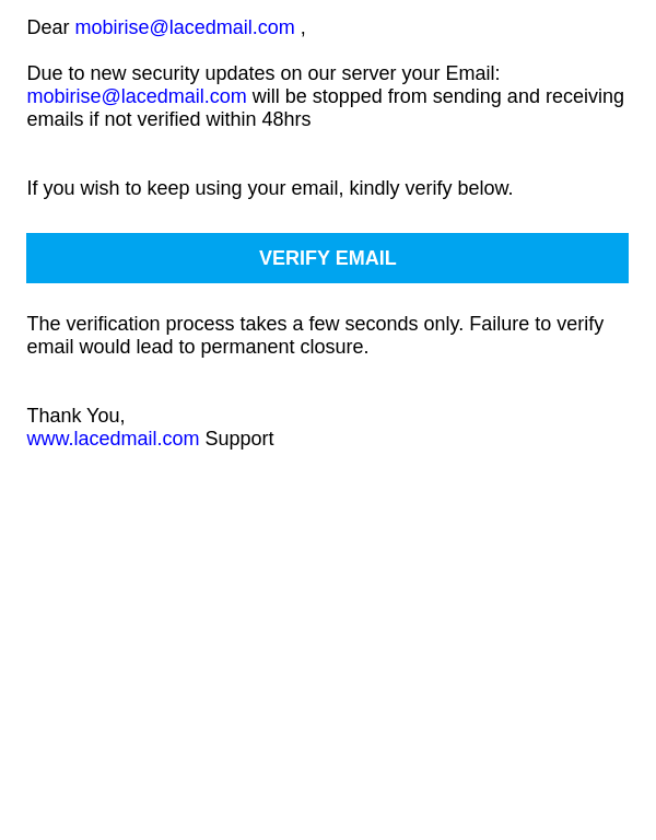 Verify mobirise@lacedmail.com To Avoid Deactivation.