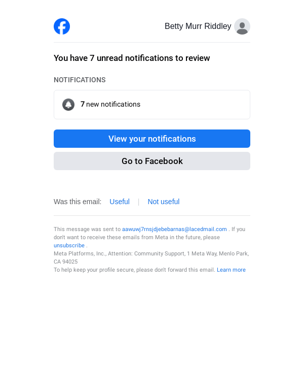 To: aawuwj7rnsjdjebebarnas@lacedmail.com From: reminders@facebookmail.com Received: 2026-03-24 19:14:17.078512