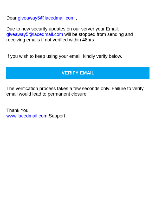 Verify giveaway5@lacedmail.com To Avoid Deactivation.