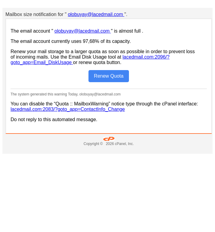 lacedmail.com WARNING: The email account "olobuyay@lacedmail.com" is almost full