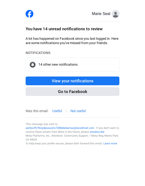 To: aarhjvcfh79nsjdjeusushs7288ebebarnas@lacedmail.com From: reminders@facebookmail.com Received: 2026-04-05 09:16:49.226756