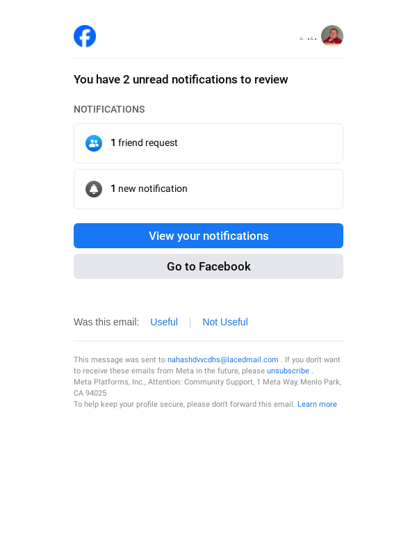 To: nahashdvvcdhs@lacedmail.com From: reminders@facebookmail.com Received: 2026-04-09 16:57:38.562042