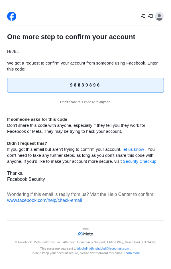 To: jdbdhdhddhhshdbhd@lacedmail.com From: security@facebookmail.com Received: 2026-04-15 17:39:59.956876