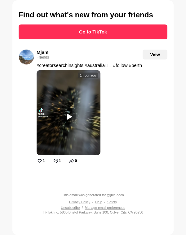 To: jullieleach242@lacedmail.com From: notification@service.tiktok.com Received: 2026-04-18 14:30:12.035233