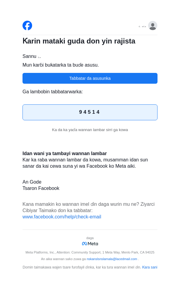To: nskanslsnslamala@lacedmail.com From: registration@facebookmail.com Received: 2026-04-18 22:21:58.518127