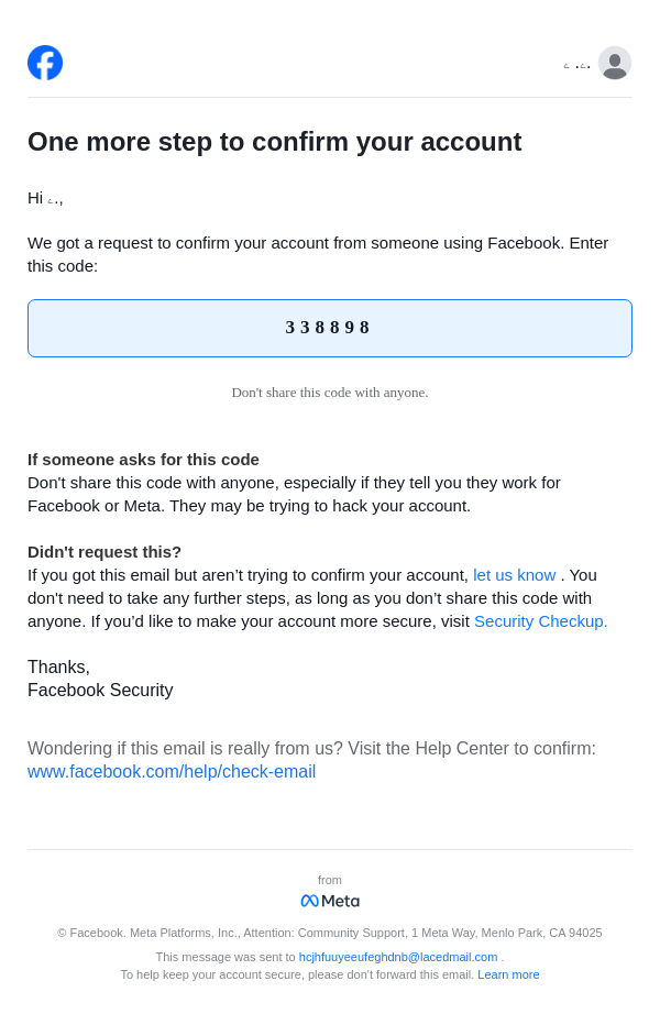 To: hcjhfuuyeeufeghdnb@lacedmail.com From: security@facebookmail.com Received: 2026-04-19 09:04:11.378428