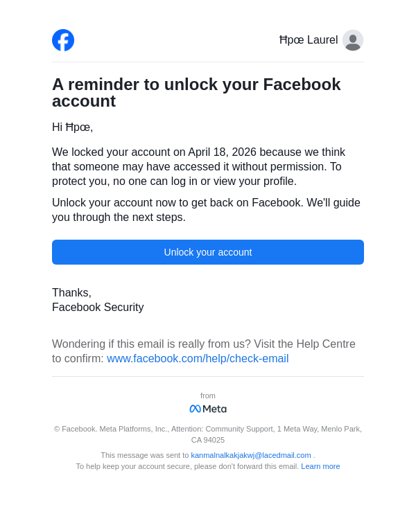 To: kanmalnalkakjakwj@lacedmail.com From: security@facebookmail.com Received: 2026-04-20 07:21:30.843995