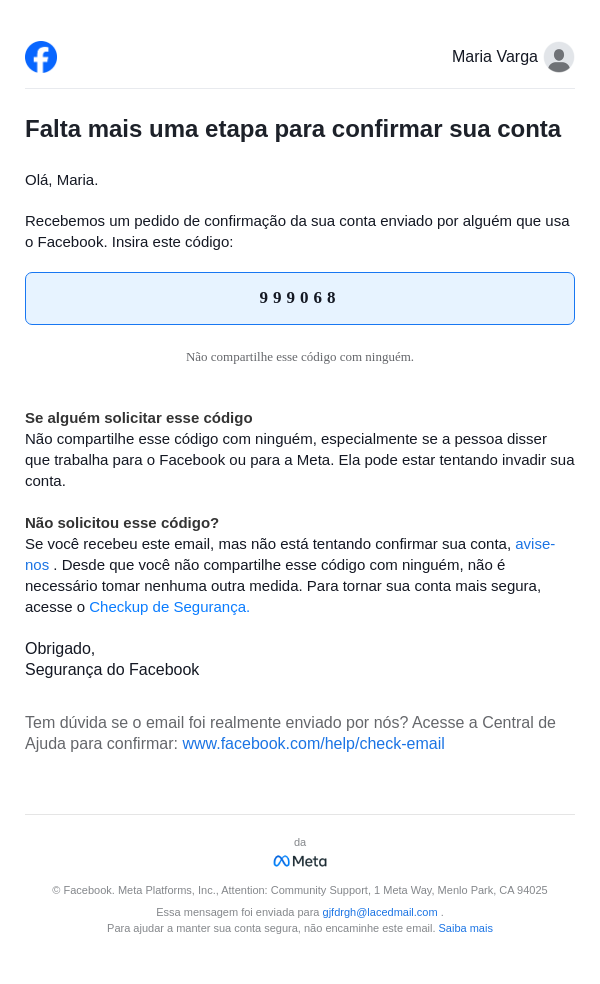 Seu código do Facebook é 999068